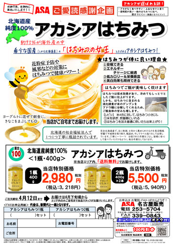 お得物品販売にて、「アカシアはちみつ・いかめし」の販売を開始致しました。