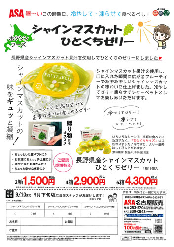 お得物品販売にて、「水ようかん・シャインマスカットゼリー」の販売を開始致しました。